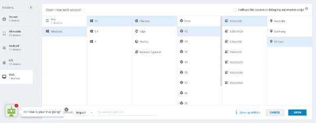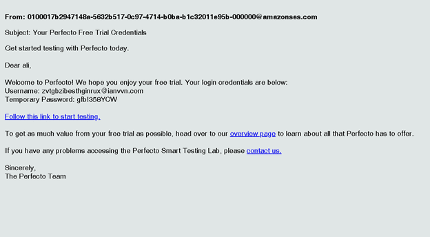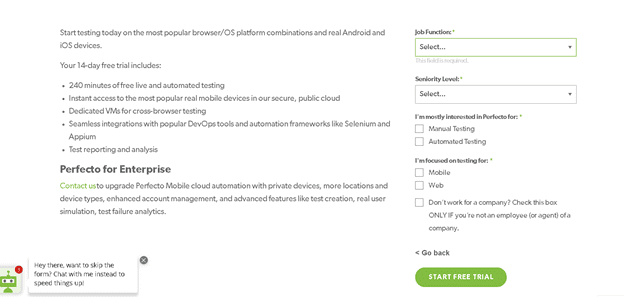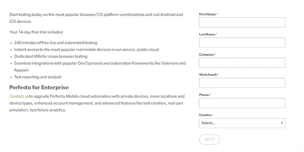 پسازآنکه در صفحهی بالابر روی Free Trial کلیک کردید باید فرم های زیر را به ترتیب پرکرده تا یک ایمیل برای شما از طرف no-reply@perfecto.io ارسال شود.