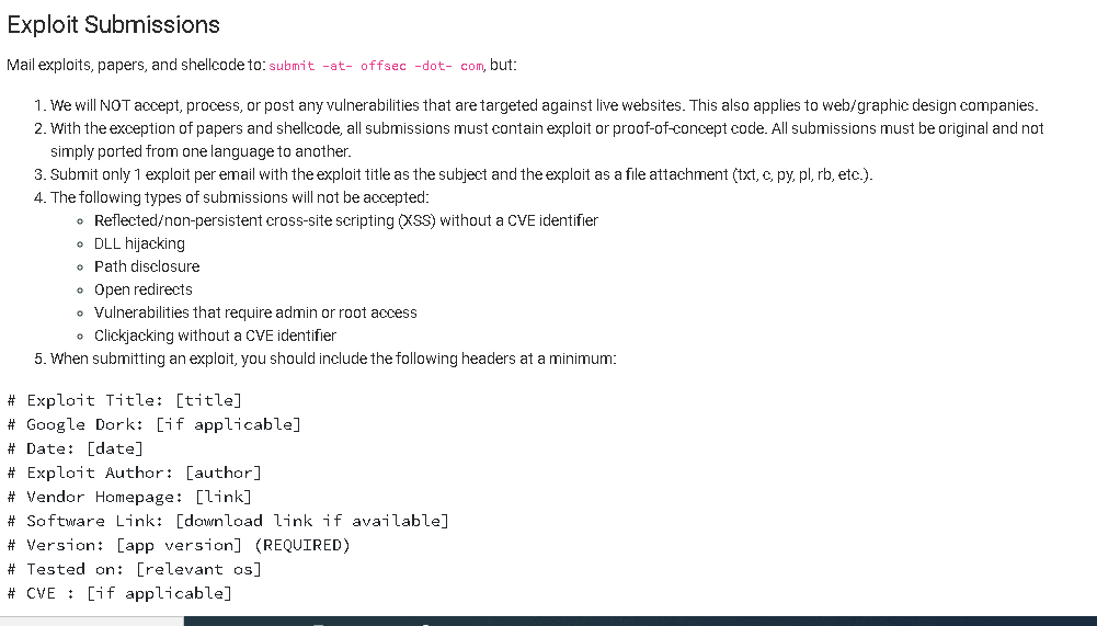 ابتدا وارد این آدرس شوید تا راهنماییهای ارائهشده توسط شرکت Offensive Security سازندهی وبسایت EXPLOIT-DB را بشناسید. و همانطور که مشاهده میکنید دقیقاً نحوهی ارائه اکسپلویت های شناساییشده را توضیح میدهد که به چه صورت باید ثبت کرد. باهم میریم که این فرم کلی را بررسی کنیم تا یک ثبت اکسپلویت در Exploit-db موفق داشته باشیم.