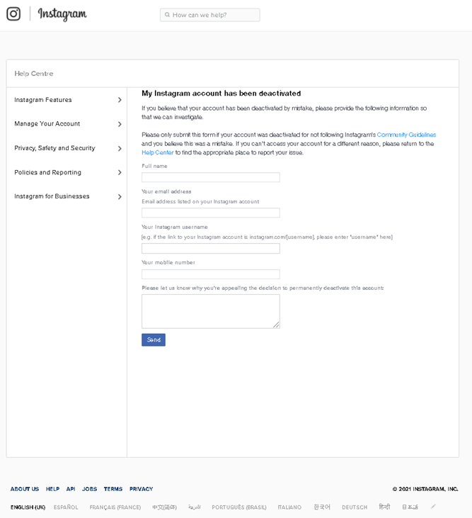 - Please Let us know … : در این قسمت باید توضیح دهید که اکانت شما غیرفعال شده است و باید حتماً دلیل آن را ذکر کرده و با احترام از اینستاگرام بخواهید که اکانت شمارا مجدداً فعال کند.