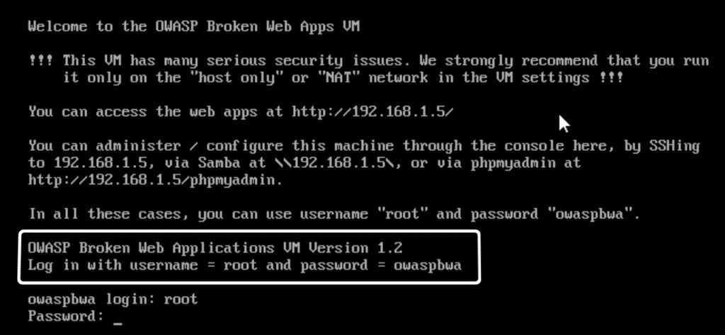 زمانی که سیستمعامل آسیبپذیر خ بالا آمد با UserName: root و PassWord: owaspbwa وارد سیستمعامل میشویم.